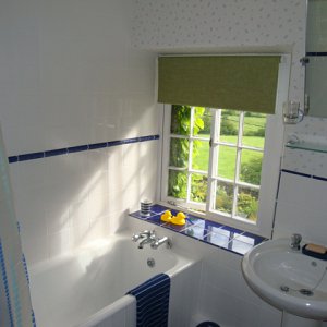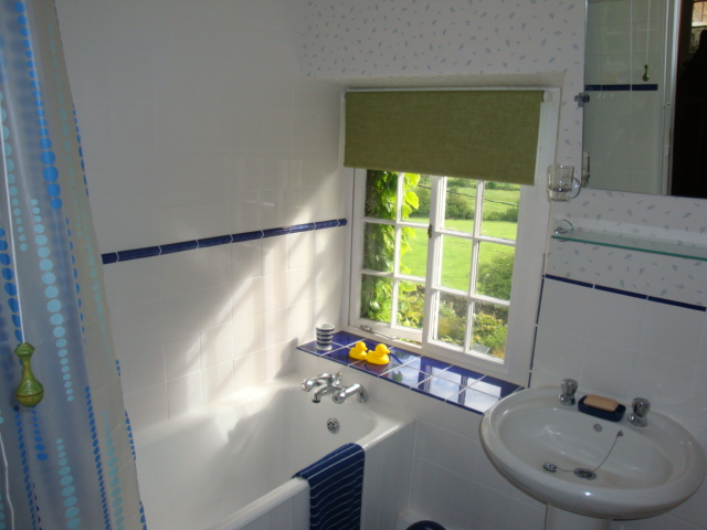 The bathroom is south facing and sunny with an electric shower over the bath, a loo and a wash hand basin. (There is a second cloakroom loo downstairs off the back kitchen).