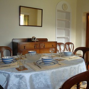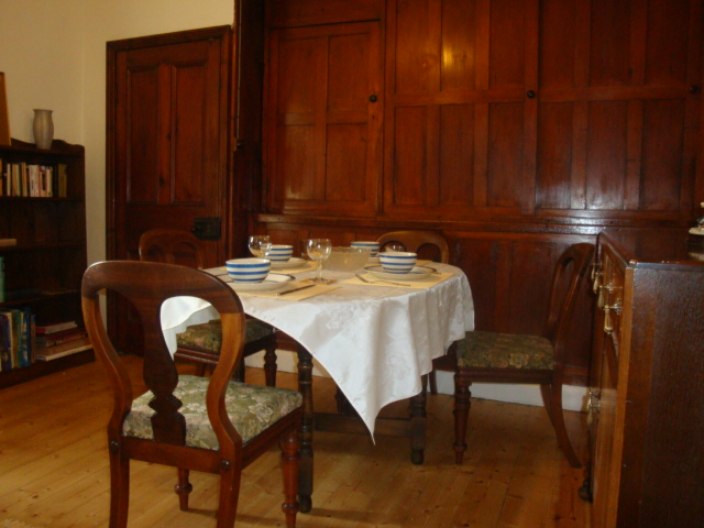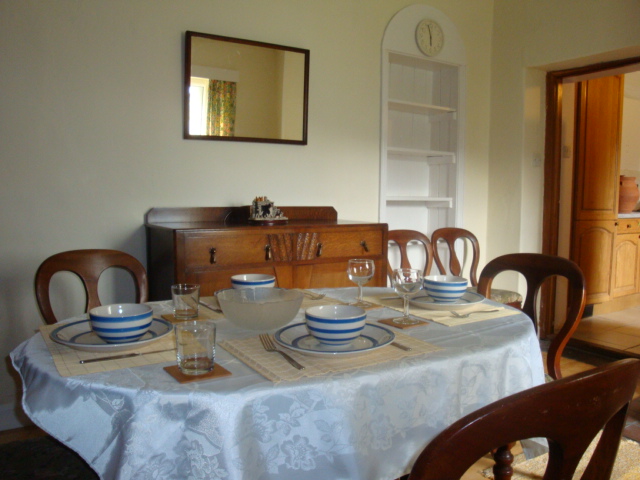 Next to the kitchen is a living/dining room where 6 people can comfortably sit around a table together. There is a wood burning stove in this room, and a small television. This is a good place to read or watch the telly away from the rest of the family. Dogs love stretching out in front of the wood burner.